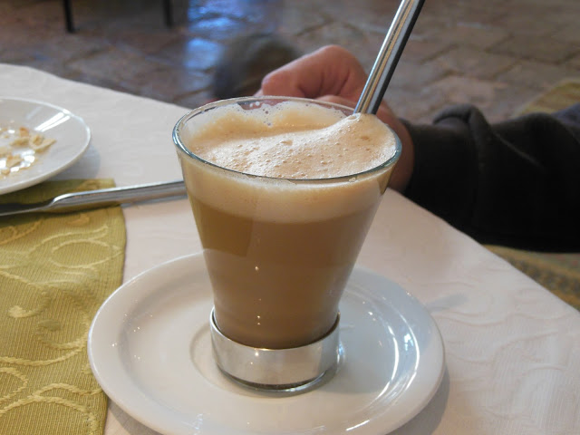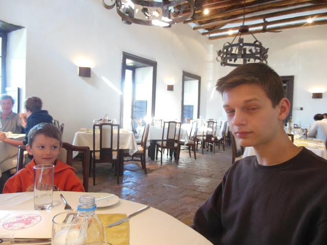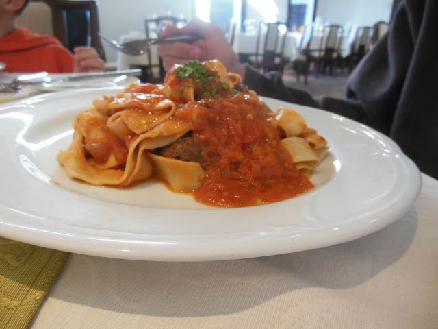 Then a delicious dinner at the restaurantThese food pictures are for you, Emily! Our appetizer was fried mozzarella on the left and on the right is smoked salmon, steak tartar, and octopus. Water always comes in a bottle though the tap water is good and very safe to drink. Water is either sin gas or con gas. That is sin(without) gas or carbonation or con (with).