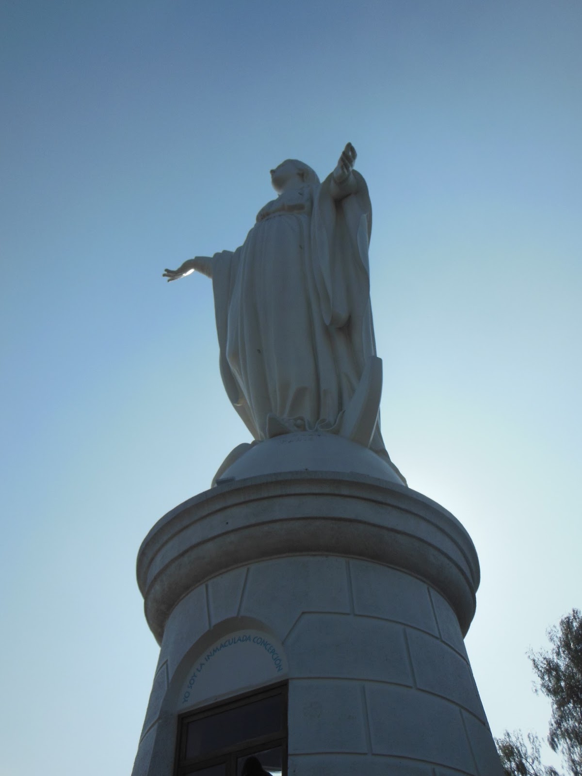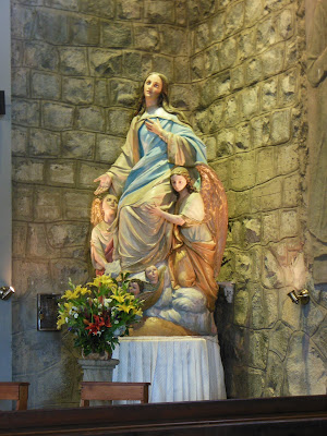 And at the very top is a large white statue of the Blessed Virgin Mary. Inside the base is a small chapel with a crucifix and a large Bible and some beautiful paintings.