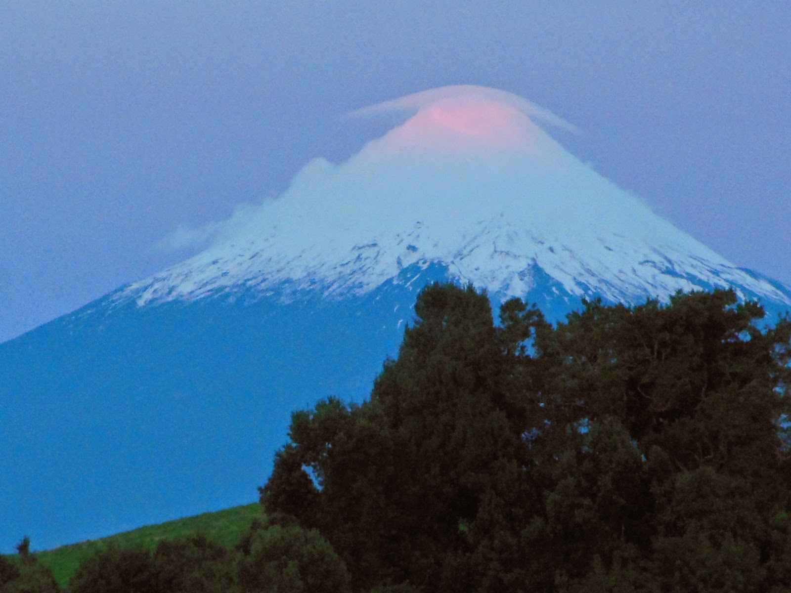 Here is our favorite fast food treat - pan con chicharrones - yummy goodness for bacon lovers. This is a roll that has chunks of smoked pork baked into it. It costs about $1 per roll. You can find it at most bakeries and every little town has a market with at least a small bakery in it and a few specialty chilean breads like the maraqueta roll. More on that later. And now I will leave you with a few spectacular pictures because Volcan Osorno's presence is always here and the beautiful wide open skies.