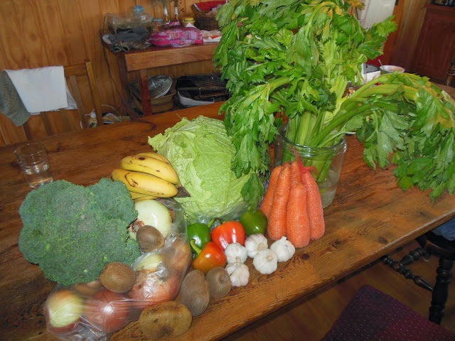 This includes the gargantua celery, a huge head of cabbage, a very large stem of broccoli, 5 cloves of garlic, 4 bell peppers, 5 kiwi, 8 bananas, 9 onions, and a bag of 7 carrots (the sweetest I've ever eaten!) All this costs 9,000 pesos or about $18.